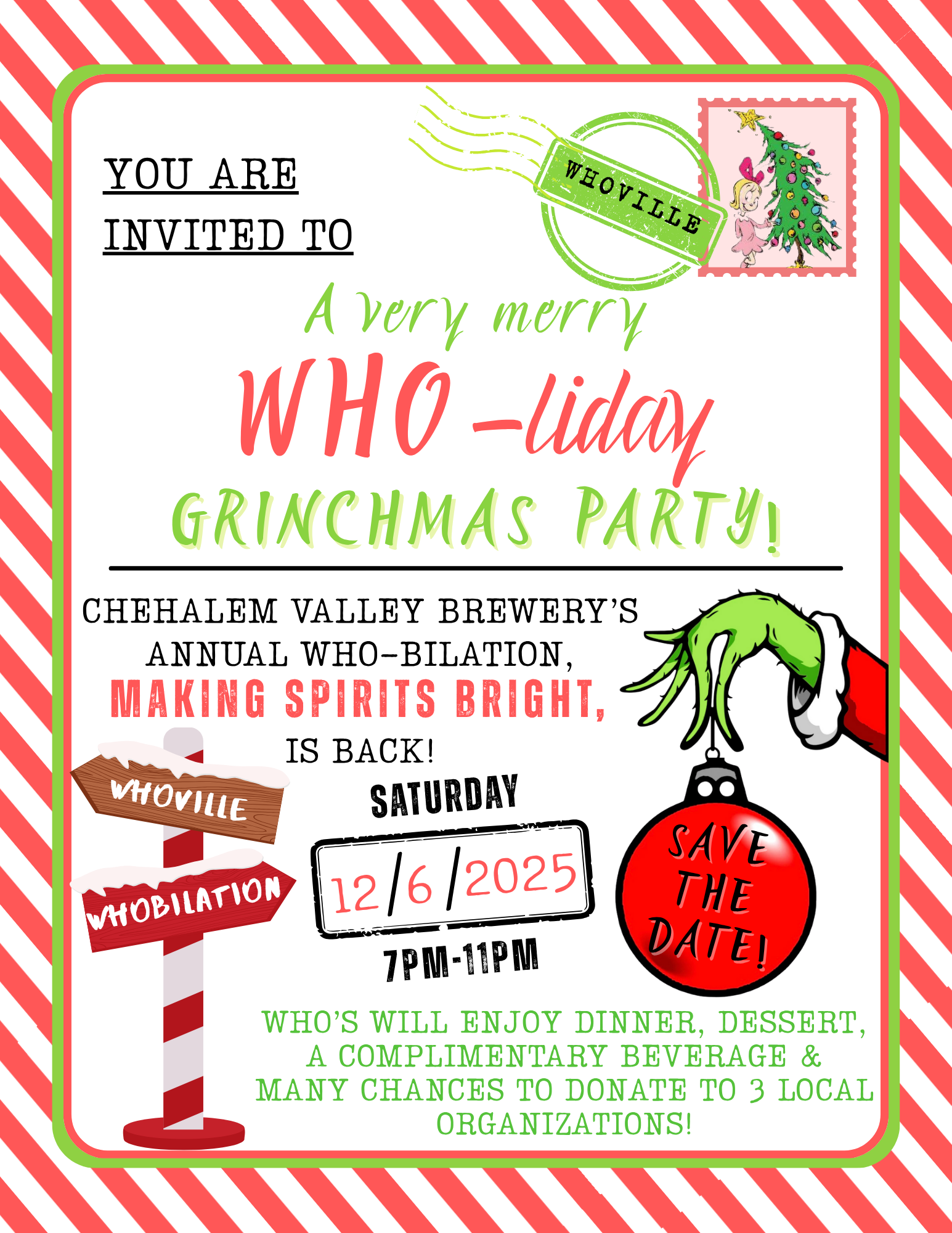 Join us for our fourth year in a row with Making Spirits Bright! Each year, we choose a holiday theme and run with it! This year dress up in your best WHOVILLE outfit and enjoy Whoville inspired dinner, dessert, and many chances to give back to our local community.